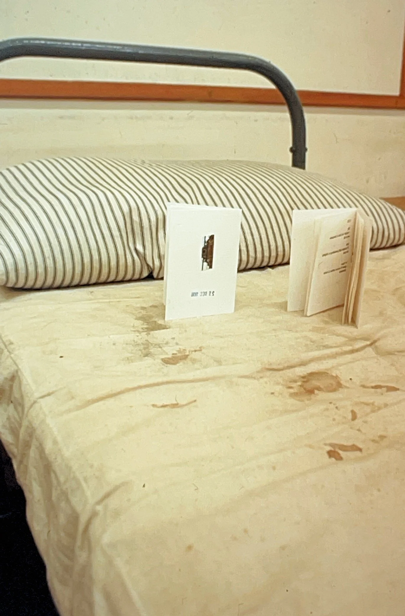 viewers admitted singly, given a walkman containing audio tape of woman's voice reciting names of the 329 'bed borrowers' catalogued alphabetically, surname followed by first name/s, viewers reminded of confidential nature of the material - viewers not personally known to the artist given an alternative tape of anonymous statistics regarding the 329 'bed borrowers'