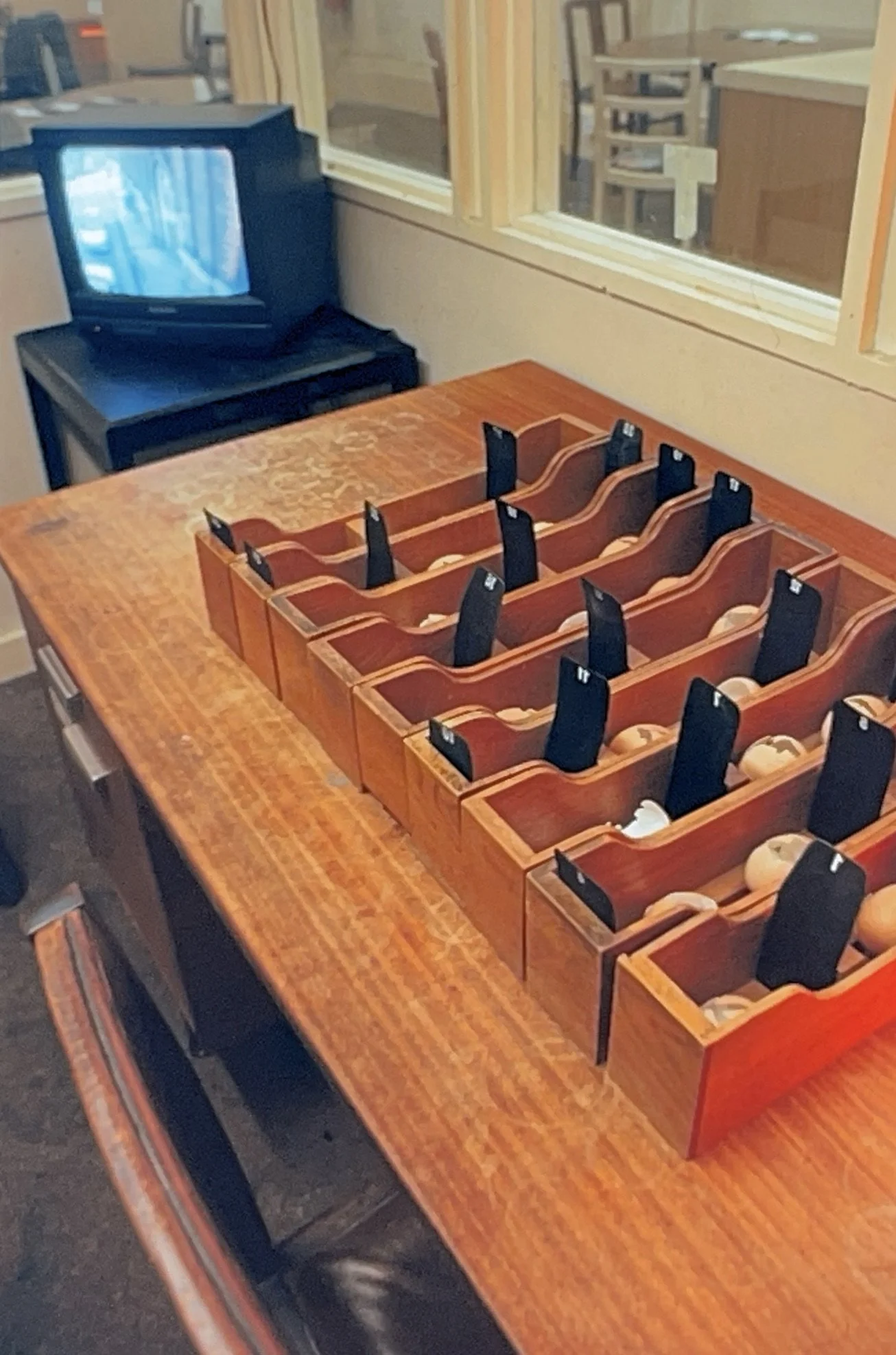 25 reconstructed eggshells each containing a cochinealed seashell 'heart' in library trays CCTV monitor trained on door of shelter, volume high