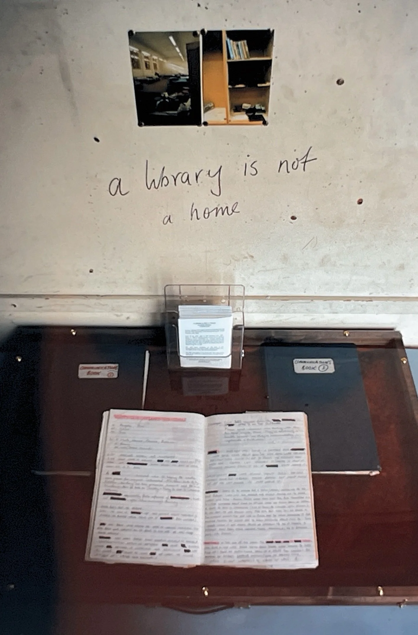 The installation included 254 books (A7 size) each book containing selected extracts from one night's entries in the Staff Communications Book, date stamped and bearing a fragment of a photograph of the exterior of the building.