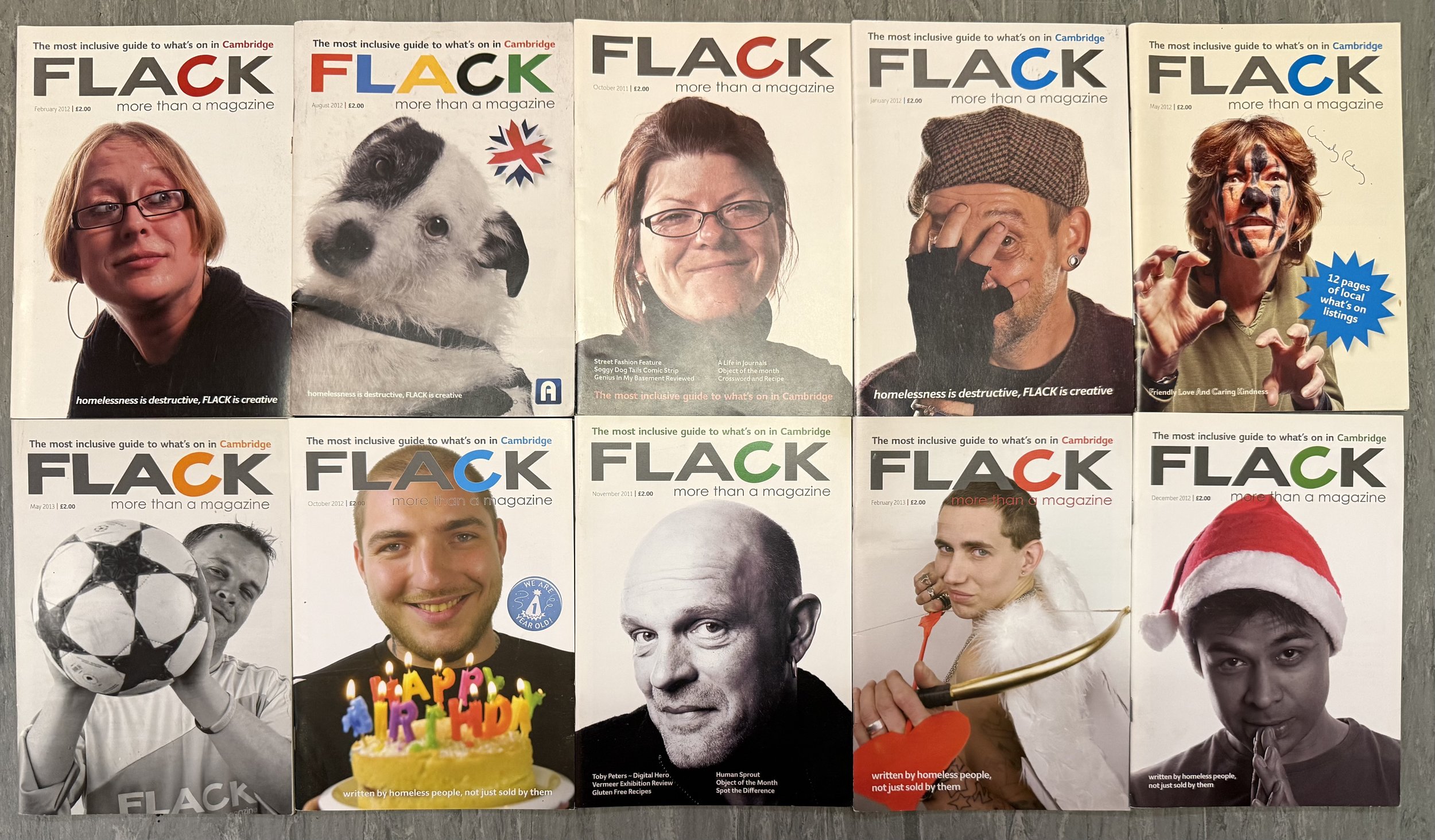 FLACK was an award winning charitable social enterprise involving homeless people in all aspects of producing a vibrant monthly what’s on listings magazine for Cambridge, written by members of the city’s homeless community (not just sold by them). FLACK left labels at the door and grew the hope and confidence needed to break the cycle of homelessness.