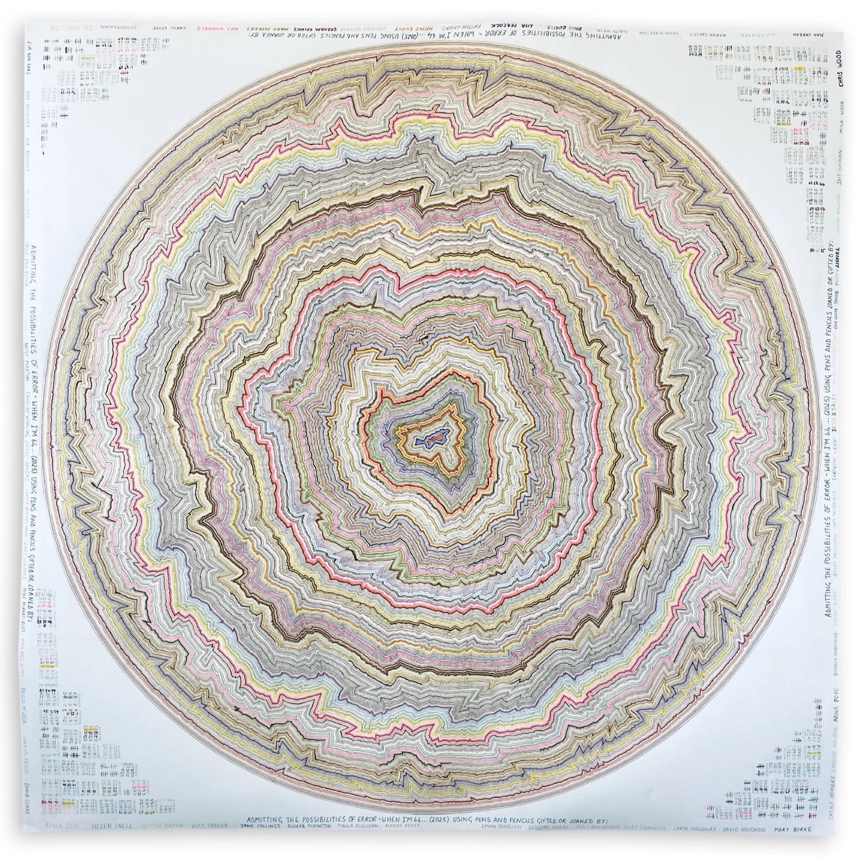 2025 marks two anniversaries : Ten years since I made the largest ‘Admitting the Possibilities of Error’ drawing I have ever made at Performance Arcade in Wellington, New Zealand. The pens and pencils that I used were given (or loaned) to me by passers-by who were drawn in to engage. It was my 64th birthday on February 1st 2025.